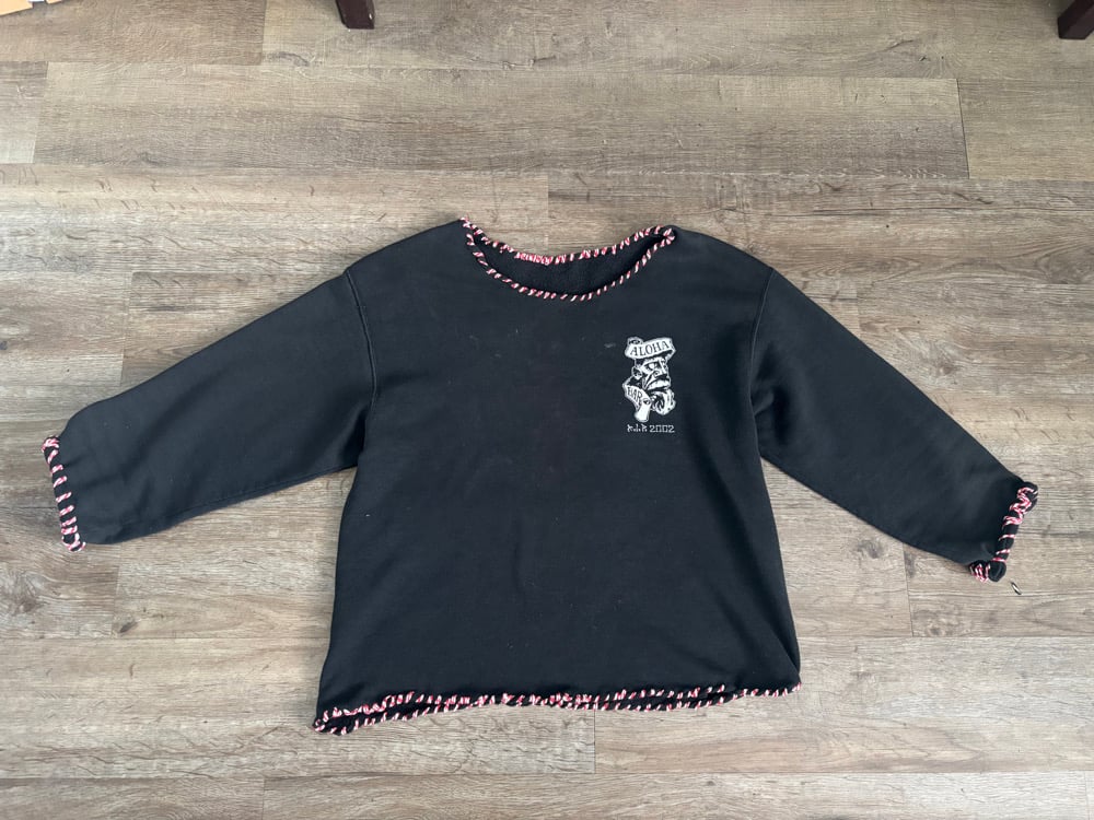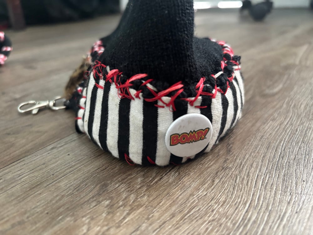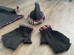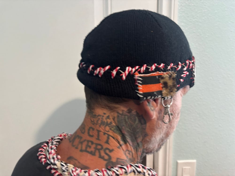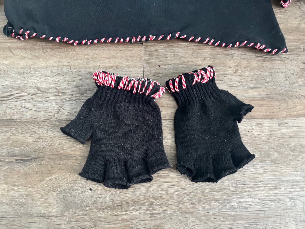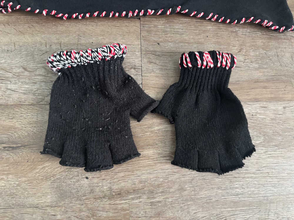 i made the hat and added all the accessories hand sewed ,added a nice little hook on there you can hook onto your pants the gloves are military issue. I threaded the wrist of each glove and then my aloha sweatshirt from Hawaii from the real Aloha bar that is now closed and I threaded that… all very personal and all very rare custom by me