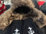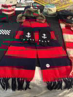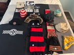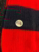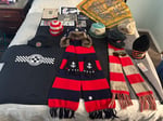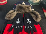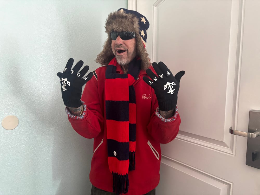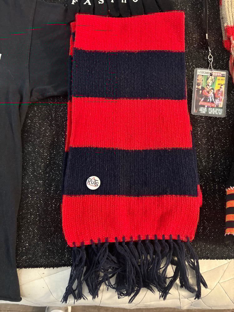 My super warm USA, winter hat, my old school hold fast gloves that I scored when my band was super big on the road all the time I got these gloves I never wore them. They stayed in my special box with things that I just wanted to keep new so they’re definitely vintage from the 90s and the scarf is from my 20s so I’ve had the scarf over 30 years.ORIGINAL RUTS PIN on scarf!!!
